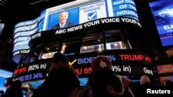 选举夜即景:人们在纽约时代广场观看美国大选实时计票情况