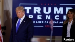 共和党总统候选人、现任总统特朗普走入白宫东厅,支持者欢呼。