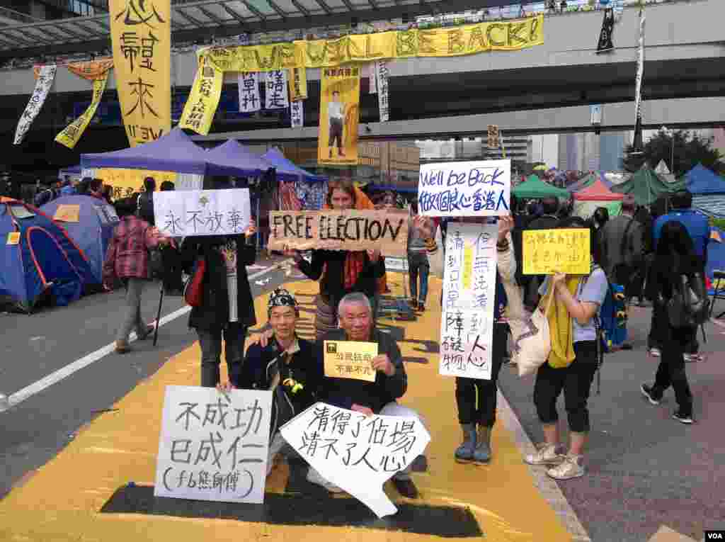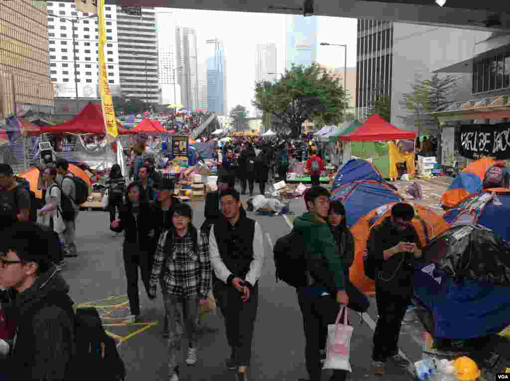 香港争取真普选的占领运动12月11日踏入第75天,这一天也是外界广泛关注的香港警方对金钟占领区展开全面清场的日子。在港府和警方呼吁占领者尽快离开,市民星期四尽量避免前往占领区的同时,上万市民星期三晚云集金钟,希望见证历史,而学联、学民思潮及多位泛民议员都通宵留守。 请看美国之音记者海彦在现场拍摄的照片。